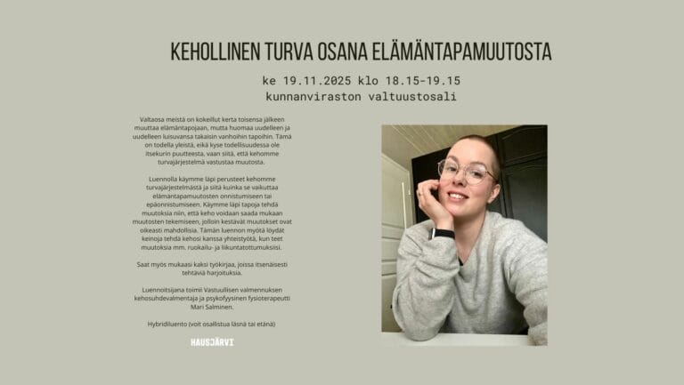Tunnilla sovelletaan pilates ja liikkuvuus harjoitteita. Sopii aloittelijoille. Maksuton ilmoittautuminen sähköpostiin heidi.tormanen@hausjarvi.fi. Tunnille tarvitset mukaan oman jumppamaton ja juomapullon. Tervetuloa!
