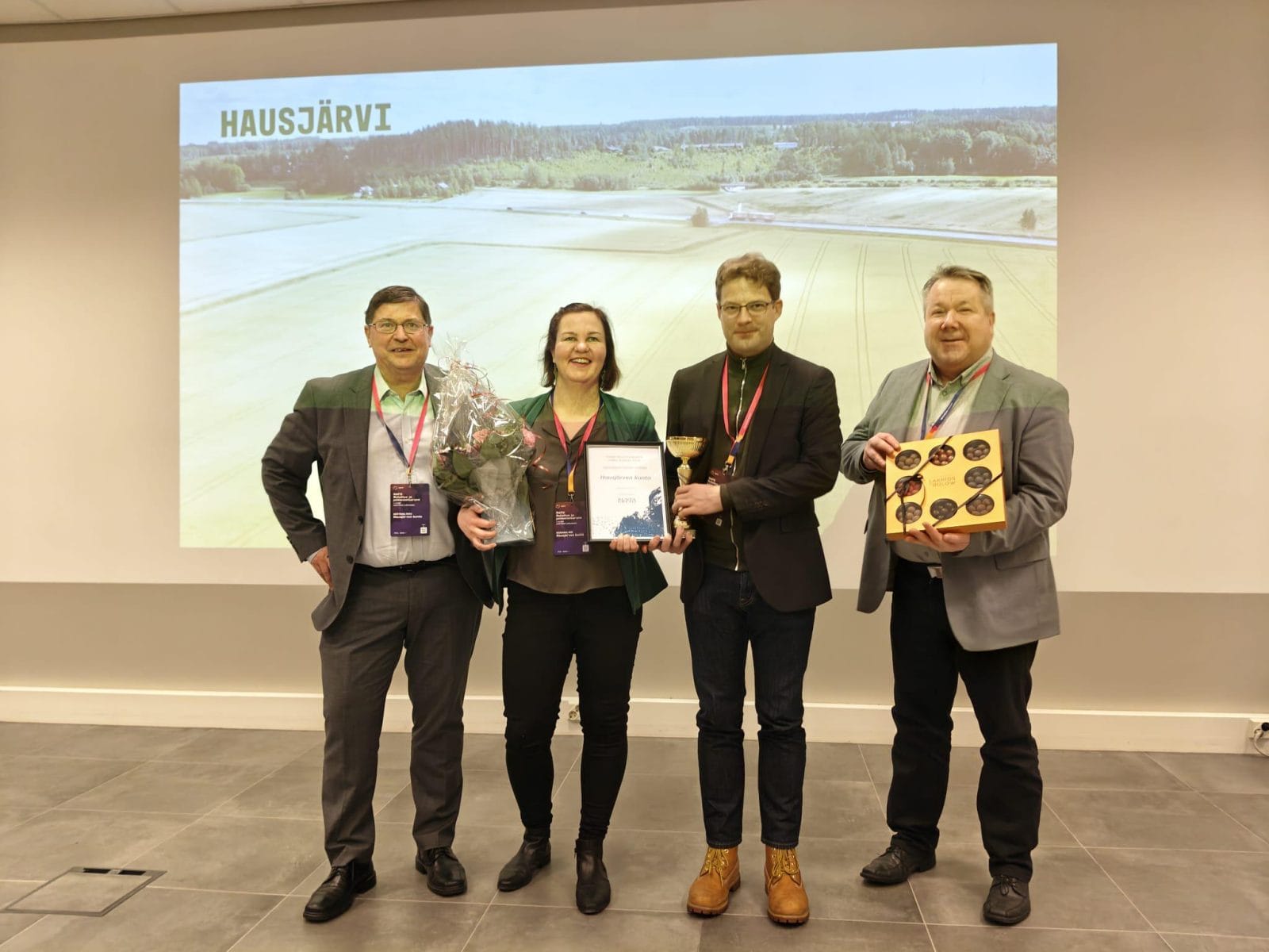 Hausjärven kunnanjohtaja Pekka Määttänen, talous- ja henkilöstöjohtaja Meri Ruuskanen, kunnanhallituksen puheenjohtaja Kyösti Arovuori ja kunnanvaltuuston puheenjohtaja Risto Tiippana iloitsivat palkinnosta.
