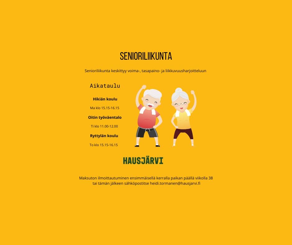 Omat liikuntaryhmät senioreille alkavat viikolla 38. Omat liikuntaryhmät senioreille alkavat viikolla 38. Ryhmät kokoontuvat Hikiässä Eskon koulun liikuntasalissa maanantaisin klo 15.15-16.16, Oitin työväentalolla tiistaisin klo 11-12 sekä Ryttylän koulun liikuntasalissa torstaisin klo 15.15-16.15.
