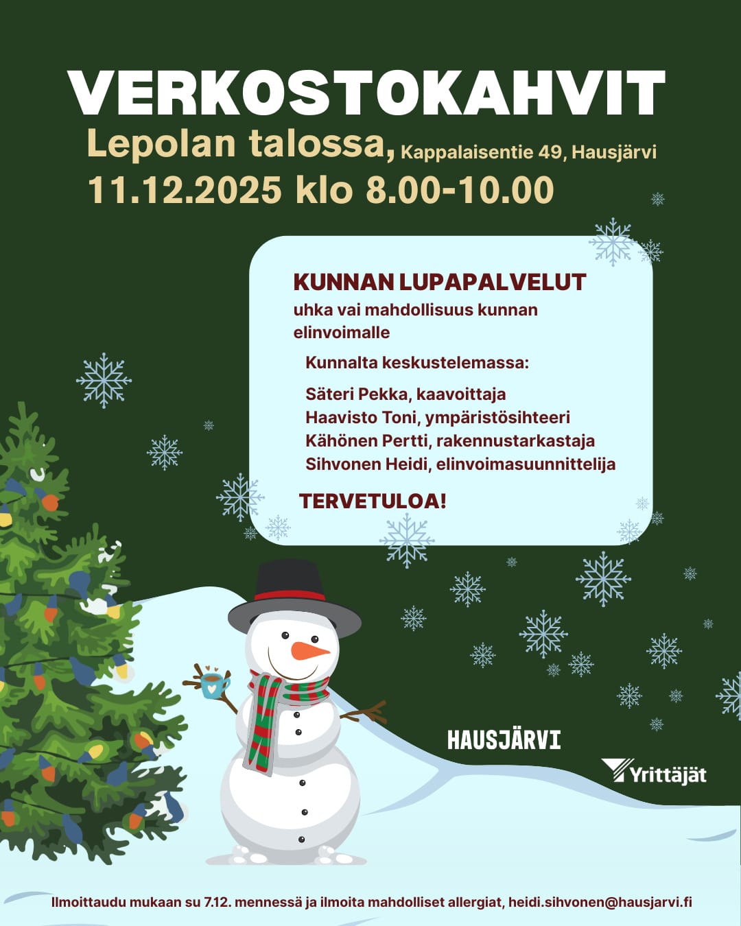 Ilmoittaudu mukaan su 7.12. mennessä ja ilmoita mahdolliset allergiat, heidi.sihvonen@hausjarvi.fi
