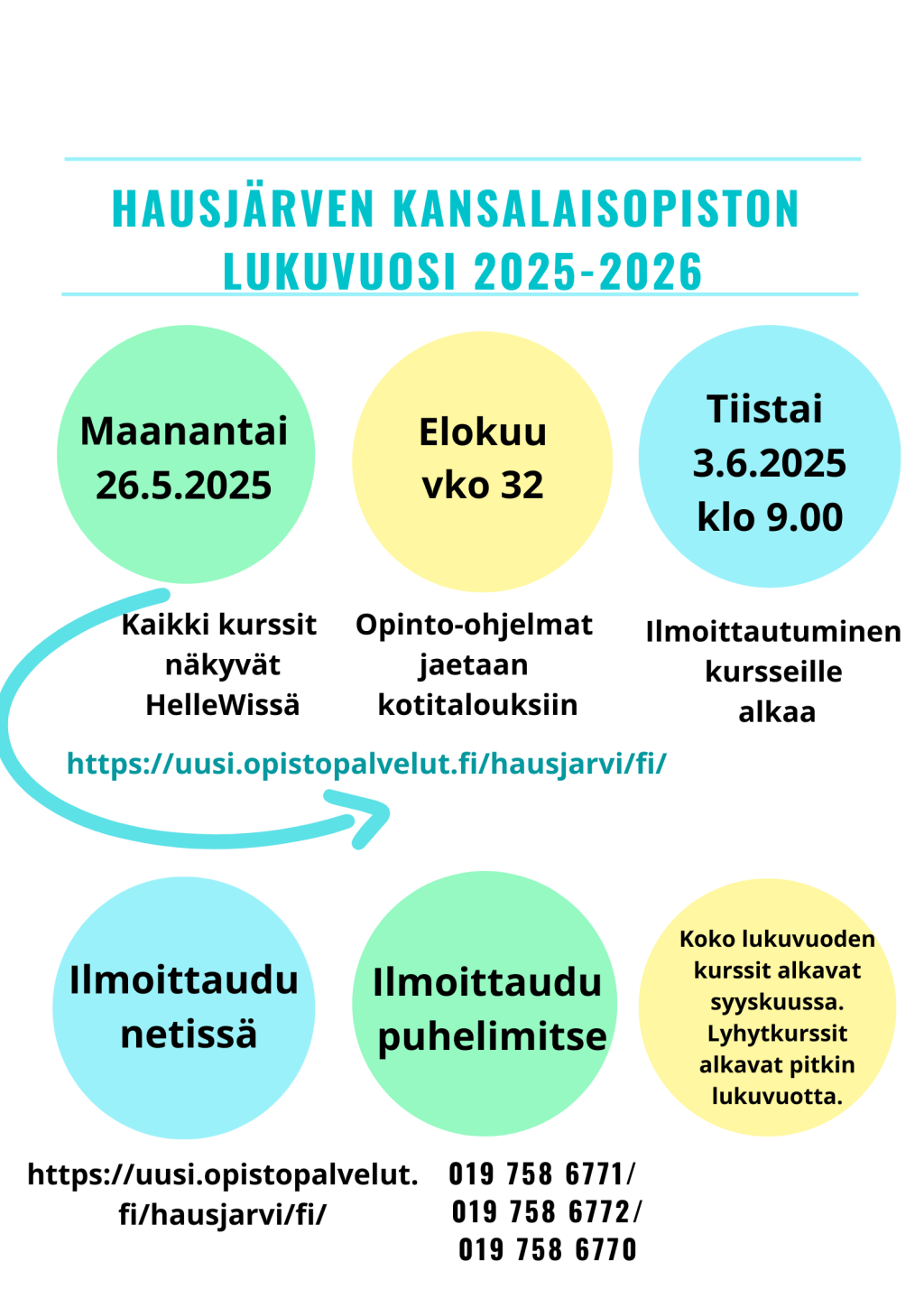 Lukuvuoden 2025-2026 kurssiohjelmaan voit tutustua: https://uusi.opistopalvelut.fi/hausjarvi