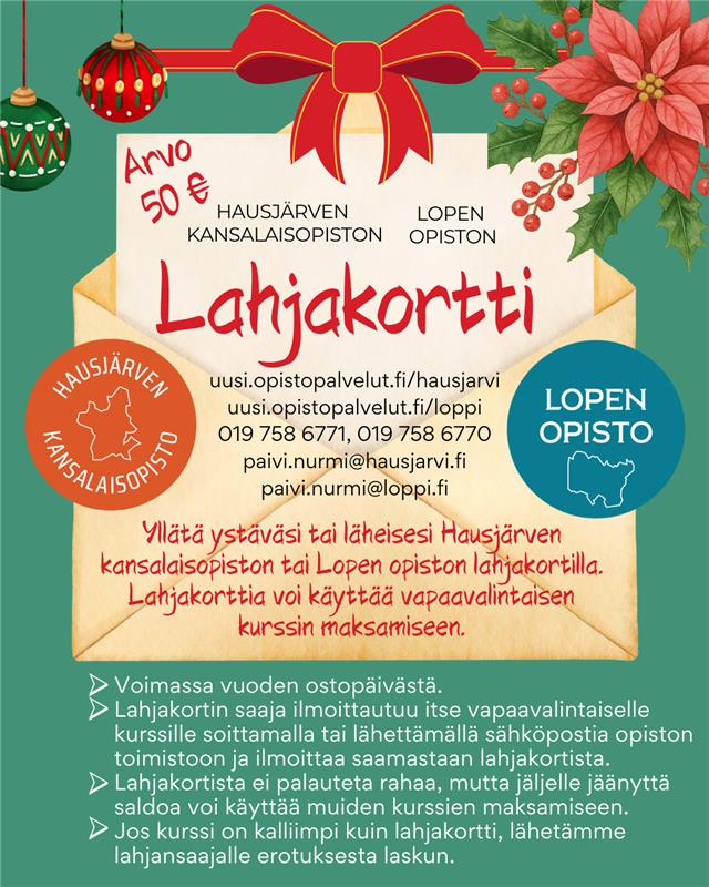 Jos haluat enemmän kuin yhden kortin, ole yhteydessä toimistoon. Saat lisätietoja kansalaisopiston toimistosta p. 019 758 6771.